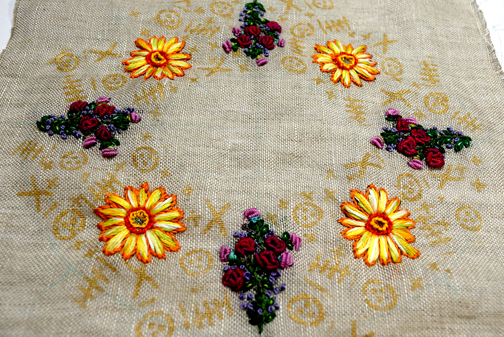Since there is only one flower used here, I decided to add a circular texture to the back. First, I colored the edge of the circle with Ranger Archival ink (Sky Blue), embossed three times with Ranger UT Embossing Powder, and then stamped Sara Naumann Set 10 (ESN10) with the same Ranger Archival ink (Sky Blue) while it's hot.