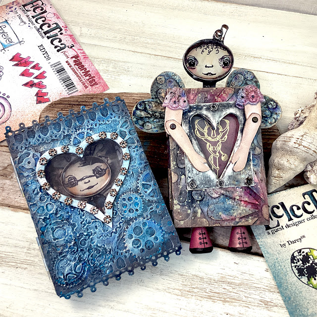 Her wings were made by using the same PS201 stencil with grunge paste and coloring it with Infusions - In The Navy and A Bit Jaded while adding water.then stamped and cut out the EDY02 heart from the back.