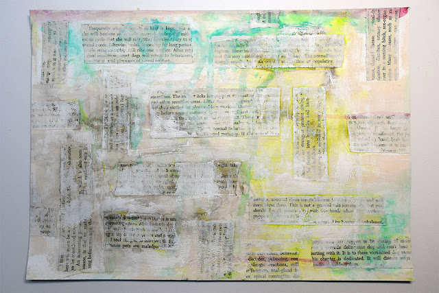 On the outside of the envelope design, I collaged piece of book page on the A4 Smoothy white card, clear gessoing over the surface, and I dropped Caribbean See, Limelight, Chocolate Pudding and Claret Frescos with water.